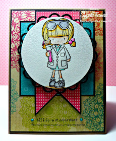 I had SO much fun making this card!!! I've been busy all weekend creating for the June Dirty Dozen gallery, so making this card was a welcome thing.  I love the idea of the circle theme, so I went with it in all of my DP (who doesn't love a good polkadot??).  The layout for my card comes from this week's Card Patterns sketch that just so happened to contain a circle.  Score!!! I have stamped the image from the TSG set called "Cutie Pi" and then watercolored it with Tombow Markers.  The sentiment that I have used comes from the set called "Chemistry".